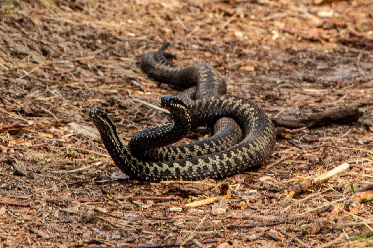 Ondanks wat ons mensen bezighoudt gaat de natuur z’n gewone gang. Het warme weer en de weldadige rust haalt adders weer uit hun winterslaap. Onze dorpsgenote Pauline Hellema betrapte deze twee – heel actieve – exemplaren in het heidegebiedje ten oosten van het fietspad Gasteren-Schipborg, en maakte er deze prachtige foto van. Aanvankelijk dacht ze dat ze aan het paren waren. Nader encyclopedisch onderzoek thuis leerde echter dat het waarschijnlijk om twee vechtende mannetjes gaat. Vrouwtjes zijn een stuk groter dan mannetjes en lichter bruin gekleurd.